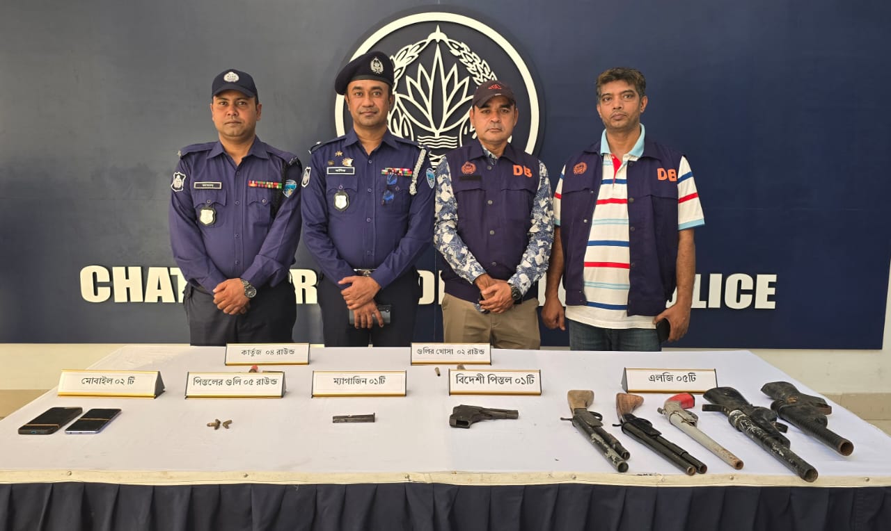 গতকাল ১৬/১১/২০২৫ খ্রি. দক্ষিণ রাঙ্গুনিয়া থানাধীন পদুয়া ইউনিয়নের মৌলভীখীল তিন রাস্তার মোড়ে জেলা গোয়েন্দা শাখা ও দক্ষিণ রাঙ্গুনিয়া থানা চেকপোস্ট স্থাপন করে হুমায়ুন উদ্দিন আকাশ প্র: লেদাইয়া–কে গ্রেফতার করে। পরবর্তীতে তার স্বীকারোক্তি ও দেখানো মতে, রাউজান থানাধীন মকবুল আহমেদ সওদাগরের বাড়ির জনৈক মাহবুবুল আলমের টিনের ঘরের পশ্চিম পাশের ঝোপের ভিতর থেকে ১টি এলজি ও ২ রাউন্ড কার্তুজ উদ্ধার করা হয়।