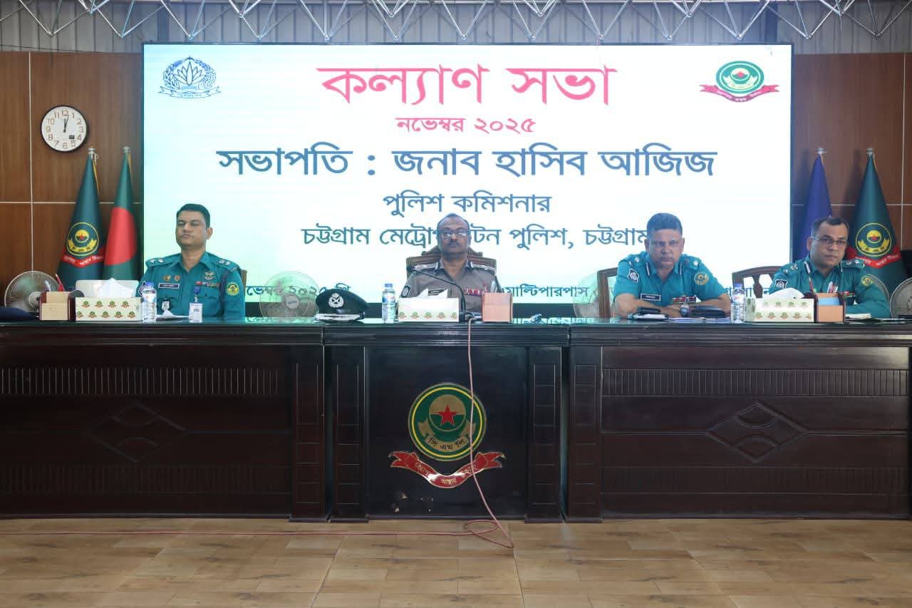 আজ ১৯ নভেম্বর সকাল ১১.০০ ঘটিকায় দামপাড়া পুলিশ লাইন্সে অবস্থিত মাল্টিপারপাস শেডে চট্টগ্রাম মেট্রোপলিটন পুলিশের নভেম্বর/২০২৫ মাসের মাসিক কল্যাণ সভা অনুষ্ঠিত হয়। উক্ত সভায় সভাপতি হিসেবে উপস্থিত ছিলেন সিএমপি কমিশনার হাসিব আজিজ, বিপিএম। সভায় কমিশনার চট্টগ্রাম মেট্রোপলিটন পুলিশের সকল সদস্যদের সততা, নিষ্ঠা ও কর্তব্যপরায়ণতার সাথে দায়িত্ব পালনের নির্দেশ দেন। তিনি পুলিশ সদস্যদের সমস্যার কথা শুনেন এবং তাৎক্ষণিক সমাধানের ব্যবস্থা করেন।
