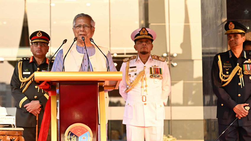 সশস্ত্র বাহিনী দিবস উদ্যাপন উপলক্ষ্যে আয়োজিত সংবর্ধনা অনুষ্ঠানে সবাইকে স্বাগত জানিয়ে প্রধান উপদেষ্টা বলেন, ‘বাংলাদেশ সশস্ত্র বাহিনীর জন্ম ১৯৭১ সালের রণক্ষেত্রে। ১৯৭১ সালের ২১ নভেম্বর সেনাবাহিনীর সঙ্গে নৌ ও বিমানবাহিনী সম্মিলিতভাবে পাকিস্তানি বাহিনীর বিরুদ্ধে লড়েছিল বলে এই দিনটিকে মুক্তিযুদ্ধের এক মাইলফলক হিসেবে গৌরবের সঙ্গে পালন করা হয়। আমরা যদি বিজয় অর্জন না করতাম তবে এই বীর সেনাদের মৃত্যুদণ্ড ছিল অনিবার্য এবং তাদের পরিবারের সকল সদস্যের জীবন হয়ে উঠত অসহনীয়। মুক্তিকামী সেনা, নৌ ও বিমান বাহিনীর অকুতভয় বীর সেনানীরা জীবনের পরোয়া না করে, পরিবারের ভবিষ্যতের কথা না ভেবে স্বাধীনতা যুদ্ধে ঝাঁপিয়ে পড়েছিলেন। তাঁরাই আপামর জনসাধারণকে সাহস জুগিয়েছেন এবং জল, স্থল ও আকাশপথে সম্মিলিত প্রতিরোধ গড়ে তুলে দেশকে পরাধীনতার শৃঙ্খল থেকে মুক্ত করেছেন।’