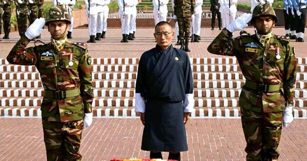 বাংলাদেশে সফররত ভুটানের প্রধানমন্ত্রী শেরিং তোবগে শনিবার সাভারের জাতীয় স্মৃতিসৌধের মুক্তিযুদ্ধের শহীদদের প্রতি শ্রদ্ধা জানিয়ে স্মৃতিসৌধের বেদিতে ফুল দিয়ে শ্রদ্ধা নিবেদন করেছেন।