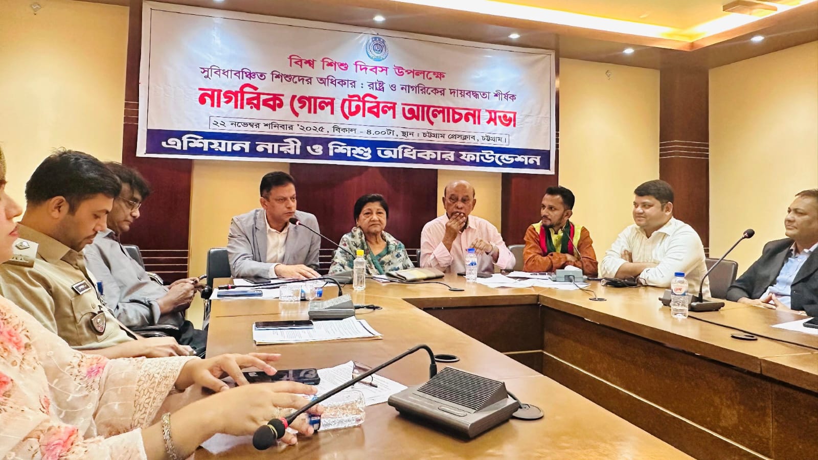 এশিয়ান নারী ও শিশু অধিকার ফাউন্ডেশনের উদ্যোগে বিশ্ব শিশু দিবস উপলক্ষে ২২ নভেম্বর (শনিবার) চট্টগ্রাম প্রেসক্লাবের সুলতান আহমেদ হলে অনুষ্ঠিত নাগরিক গোলটেবিল আলোচনায় পথশিশুদের অধিকার ও রাষ্ট্রীয় দায়িত্বের ঘাটতির বিষয়টি তীব্র সমালোচনার মুখে পড়ে। সভার শীর্ষক ছিল—“সুবিধাবঞ্চিত পথশিশুদের অধিকার: রাষ্ট্র ও নাগরিকের দায়বদ্ধতা।”