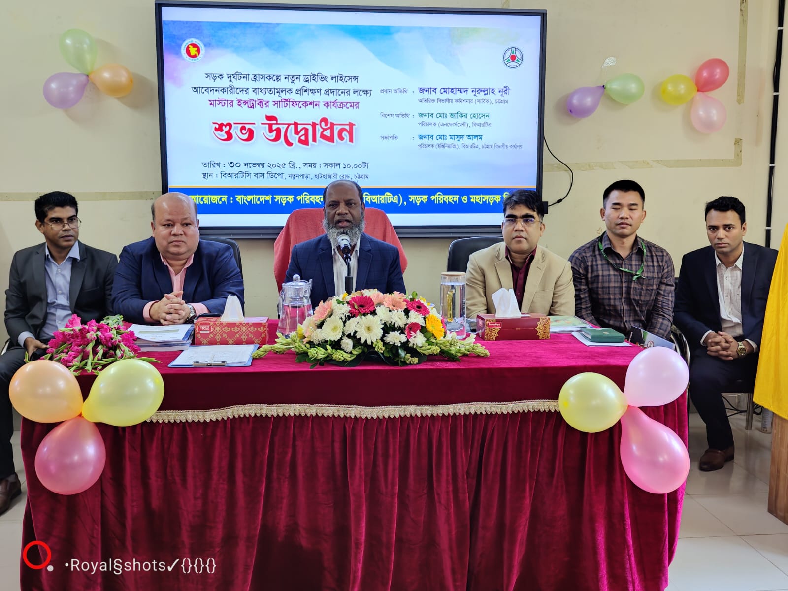 সড়ক দুর্ঘটনা হ্রাসকল্পে ড্রাইভিং স্কুলের মাধ্যমে বাধ্যতামূলক ৬০ ঘন্টা প্রশিক্ষণ গ্রহণ নিশ্চিতকরণের জন্য বিআরটিএ, সদর কার্যালয় কর্তৃক নির্বাচিত ১১১ জন মাস্টার ইন্সট্রাক্টরদের মধ্যে চট্টগ্রাম বিভাগের ১৯ জন মাস্টার ইন্সট্রাক্টর-কে দেশের অন্যান্য বিভাগের মতো অদ্য ৩০-১১-২০২৫খ্রি. রবিবার সকাল ১০.০০টায় বিআরটিএ, চট্টগ্রাম বিভাগীয় কার্যালয় কর্তৃক বিআরটিসি বাস ডিপো চট্টগ্রামের প্রশিক্ষণ কক্ষে মাস্টার ইন্সট্রাক্টর প্রশিক্ষণ কার্যক্রমের শুভ উদ্বোধন করা হয়েছে।