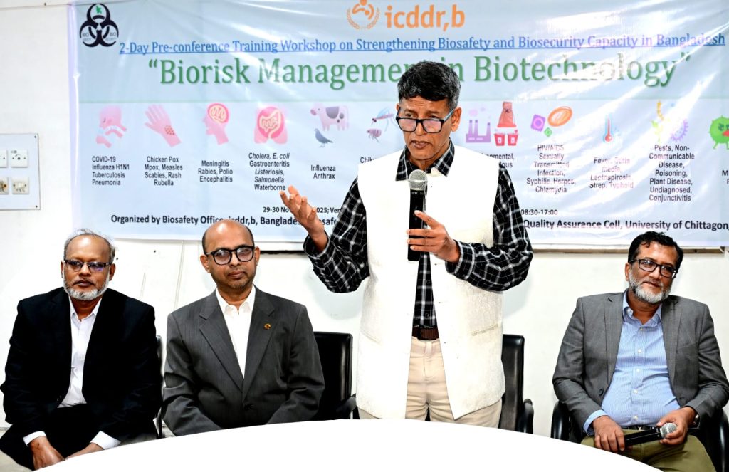 ইন্টারন্যাশনাল সেন্টার ফর ডায়রিয়াল ডিজিজ রিসার্চ, বাংলাদেশ (icddr,b)-এর বায়োসেফটি অফিস, বাংলাদেশ বায়োসেফটি অ্যান্ড বায়োসিকিউরিটি সোসাইটি এবং চট্টগ্রাম বিশ্ববিদ্যালয় ইনস্টিটিউশনাল কোয়ালিটি এস্যুরেন্স সেলের (আইকিউএসি) যৌথ উদ্যােগে ২৯ ও ৩০ নভেম্বর ২০২৫ তারিখে এই কর্মশালাটি অনুষ্ঠিত হয়। “জৈবপ্রযুক্তিতে বায়োরিস্ক ব্যবস্থাপনা” শীর্ষক কর্মশালাটির মূল লক্ষ্য ছিল গবেষণাগার এবং স্বাস্থ্যসেবা কেন্দ্রে জৈব-ঝুঁকি (Biorisk) নিয়ন্ত্রণের আধুনিক কৌশল নিয়ে আলোচনা করা। এতে বিভিন্ন মারাত্মক রোগ, যেমন কোভিড-১৯, যক্ষ্মা, কলেরা, ডেঙ্গু, ম্যালেরিয়া, ইবোলা এবং অ্যান্টিমাইক্রোবিয়াল রেজিস্ট্যান্স (AMR) এর মতো জনস্বাস্থ্য চ্যালেঞ্জগুলো কীভাবে নিরাপদভাবে মোকাবিলা করা যায়, তা হাতে-কলমে শেখানো হয়। এছাড়া, পরিবেশগত ও বায়োহ্যাজার্ডাস বর্জ্য ব্যবস্থাপনার উপরও জোর দেওয়া হয়।