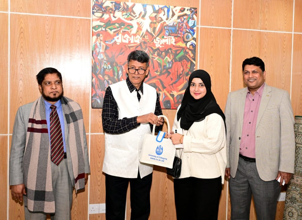 চট্টগ্রাম বিশ্ববিদ্যালয় ইনস্টিটিউট অব মেরিন সায়েন্সেস আয়োজিত ৪ দিনব্যাপী (১-৪ ডিসেম্বর ২০২৫) ‘মেরিন ফিশারিজ অ্যান্ড ব্লু ইনোভেশন: সেইফগার্ডিং ওশান হারমোনি’ শীর্ষক আন্তর্জাতিক সম্মেলনে আগত চীন, রাশিয়া ও পাকিস্থানের গবেষকবৃন্দ চট্টগ্রাম বিশ্ববিদ্যালয়ের মাননীয় উপাচার্য প্রফেসর ড. মুহাম্মদ ইয়াহ্ইয়া আখতার এর সঙ্গে উপাচার্যের দপ্তরে আজ সোমবার (১ ডিসেম্বর ২০২৫) বেলা ১২টায় সাক্ষাত করেছেন। এসময় উপস্থিত ছিলেন চবি মাননীয় উপ-উপাচার্য (একাডেমিক) প্রফেসর ড. মোহাম্মদ শামীম উদ্দিন খান ও মাননীয় উপ-উপাচার্য (প্রশাসন) প্রফেসর ড. মো. কামাল উদ্দিন। সাক্ষাৎকালে তারা বাংলাদেশের সাথে চীন, রাশিয়া, পাকিস্থানের মধ্যেকার যৌথ গবেষণা ও একাডেমিক সহযোগিতা আরও জোরদার করার বিষয়ে মতবিনিময় করেন। এসময় চট্টগ্রাম বিশ্ববিদ্যালয়ের সাথে শিক্ষক ও শিক্ষার্থী বিনিময়, যৌথ গবেষণা এবং উচ্চ শিক্ষা বিষয়ে সহযোগিতা সম্প্রসারণের সম্ভাবনা নিয়ে আলোচনা হয়।