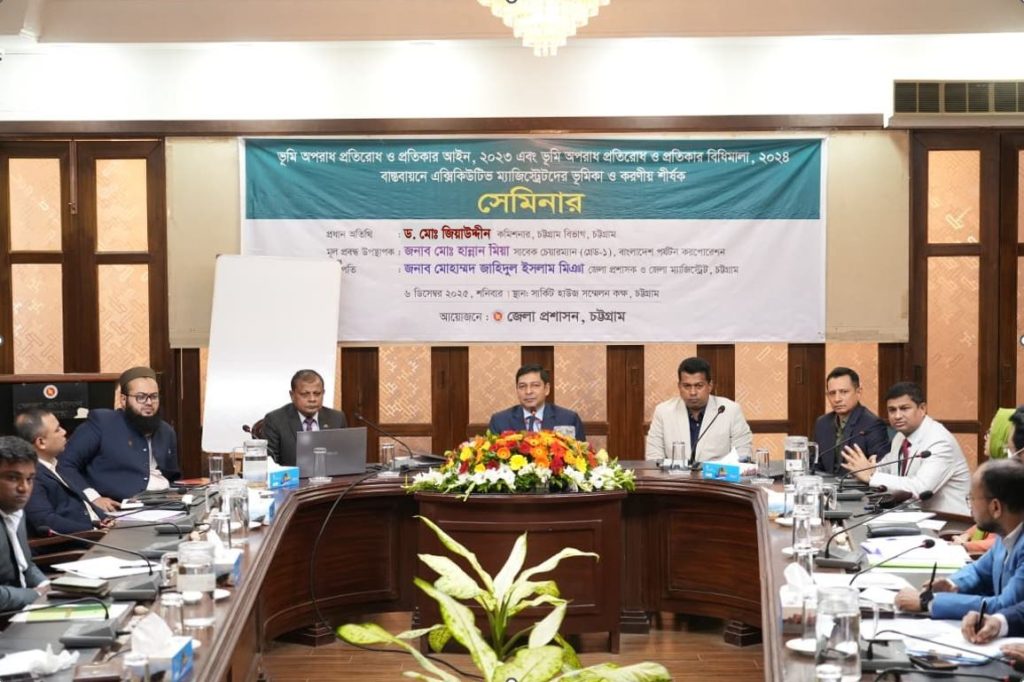 চট্টগ্রাম জেলা প্রশাসনের উদ্যোগে আজ “ভূমি অপরাধ প্রতিরোধ ও প্রতিকার আইন, ২০২৩ এবং ভূমি অপরাধ প্রতিরোধ ও প্রতিকার বিধিমালা, ২০২৪ বাস্তবায়নে এক্সিকিউটিভ ম্যাজিস্ট্রেটদের ভূমিকা ও করণীয়” শীর্ষক সেমিনার অনুষ্ঠিত হয়। চট্টগ্রামের জেলা প্রশাসক ও জেলা ম্যাজিস্ট্রেট মোহাম্মদ জাহিদুল ইসলাম মিঞা’র সভাপতিত্বে চট্টগ্রাম সার্কিট হাউস সম্মেলন কক্ষে আয়োজিত এই সেমিনারে প্রধান অতিথি হিসেবে উপস্থিত ছিলেন চট্টগ্রাম বিভাগের কমিশনার ড. মোঃ জিয়াউদ্দীন।