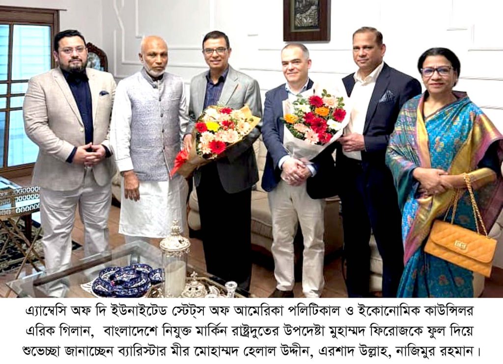 এ্যাম্বেসি অফ দি ইউনাইটেড স্টেট্স অফ আমেরিকা পলিটিকাল ও ইকোনোমিক কাউন্সিলর এরিক গিলান এবং বাংলাদেশে নিযুক্ত মার্কিন রাষ্ট্রদুতের উপদেষ্টা মুহাম্মদ ফিরোজ সাথে বাংলাদেশ জাতীয়তাবাদী দল বিএনপি চট্টগ্রাম মহানগরের আহ্বায়ক আলহাজ্ব এরশাদ উল্লাহ’র পাঁচলাইশ আবাসিকস্থল বাসভবন সাদিয়া হাউসে সাক্ষাৎ ও কৌশল বিনিময়ে সম্প্রতিগতকাল সোমবার ৮ই ডিসেম্বর অনুষ্ঠিত। এসময় উপস্থিত ছিলেন চট্টগ্রাম বিভাগীয় সহ-সাংগঠনিক সম্পাদক, বিএনপি’র মিডিয়া সেল এর সদস্য ব্যারিস্টার মীর মোহাম্মদ হেলাল উদ্দিন, চট্টগ্রাম মহানগর বিএনপির আহ্বায়ক আলহাজ্ব এরশাদ উল্লাহ, চট্টগ্রাম মহানগর বিএনপির সদস্য সচিব নাজিমুর রহমান, চট্টগ্রাম মহানগর মহিলা দলের সভাপতি মনোয়ারা বেগম মনি, সাধারণ সম্পাদক জেলী চৌধুরী।