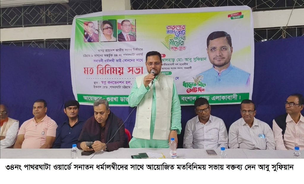 চট্টগ্রাম-৯ আসনে বিএনপি মনোনীত ধানের শীষের প্রার্থী ও দক্ষিণ জেলা বিএনপির সাবেক আহবায়ক আবু সুফিয়ান বলেছেন, হিন্দু-বৌদ্ধ-মুসলমান ও খ্রিষ্টান সবাই আমরা এই দেশের নাগরিক। বাংলাদেশের সকল নাগরিক সমান সুযোগ ও অধিকার নিয়ে বসবাস করবে-এটাই আমাদের প্রত্যাশা। সকল ধর্মের মানুষের নিরাপত্তা ও মর্যাদা নিশ্চিত করা আমাদের নৈতিক দায়িত্ব। ধর্মকে ঢাল হিসেবে ব্যবহার করে বিএনপি ক্ষমতায় যেতে চায়না। সনাতন ধর্মাবলম্বীসহ সকলের নিরাপত্তা, শান্তি ও সম্প্রীতি রক্ষায় বিএনপি সবসময় পাশে থাকবে।