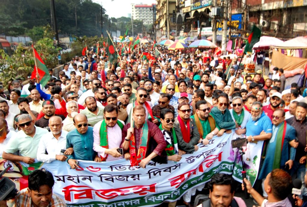 মহান বিজয় দিবস উপলক্ষে চট্টগ্রাম মহানগর বিএনপির উদ্যোগে বর্ণাঢ্য বিজয় র্যালি ও সমাবেশ অনুষ্ঠিত হয়েছে। সকাল ১০টায় পুরাতন রেলস্টেশন চত্বরে জমায়েতের মধ্য দিয়ে র্যালি শুরু হয়। র্যালিটি শহরের গুরুত্বপূর্ণ সড়ক প্রদক্ষিণ করে লালদীঘির পাড়ে গিয়ে শেষ হয়।