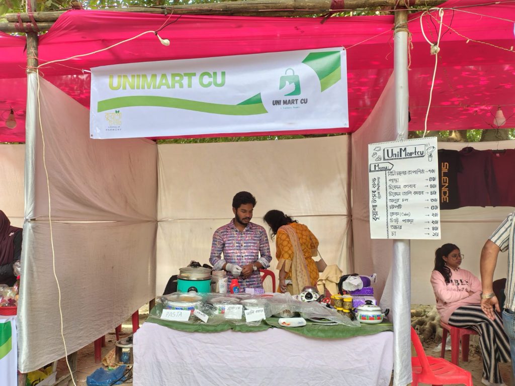 উৎসবকে কেন্দ্র করে চত্বরে বসানো হয় প্রায় ৫০টি স্টল। নবীন উদ্যোক্তাদের অংশগ্রহণে সাজানো এসব স্টলে ছিলো নানান ধরনের পিঠাপুলি, ঐতিহ্যবাহী খাবার, অলংকার, কাপড়, শাড়ি ও চাদর। এতে ভূগোল ও পরিবেশবিদ্যা বিভাগের নবীন ছাত্র উদ্যোক্তা দেবদাস বিশ্বাসের ইউনি মার্ট সিইউ (Uni Martcu) স্টলটি সবার নজরে আসে বিভিন্ন অঞ্চলের জিনিসপত্র ও ব্যতিক্রমী প্রসাধনী সমারোহের কারণে।