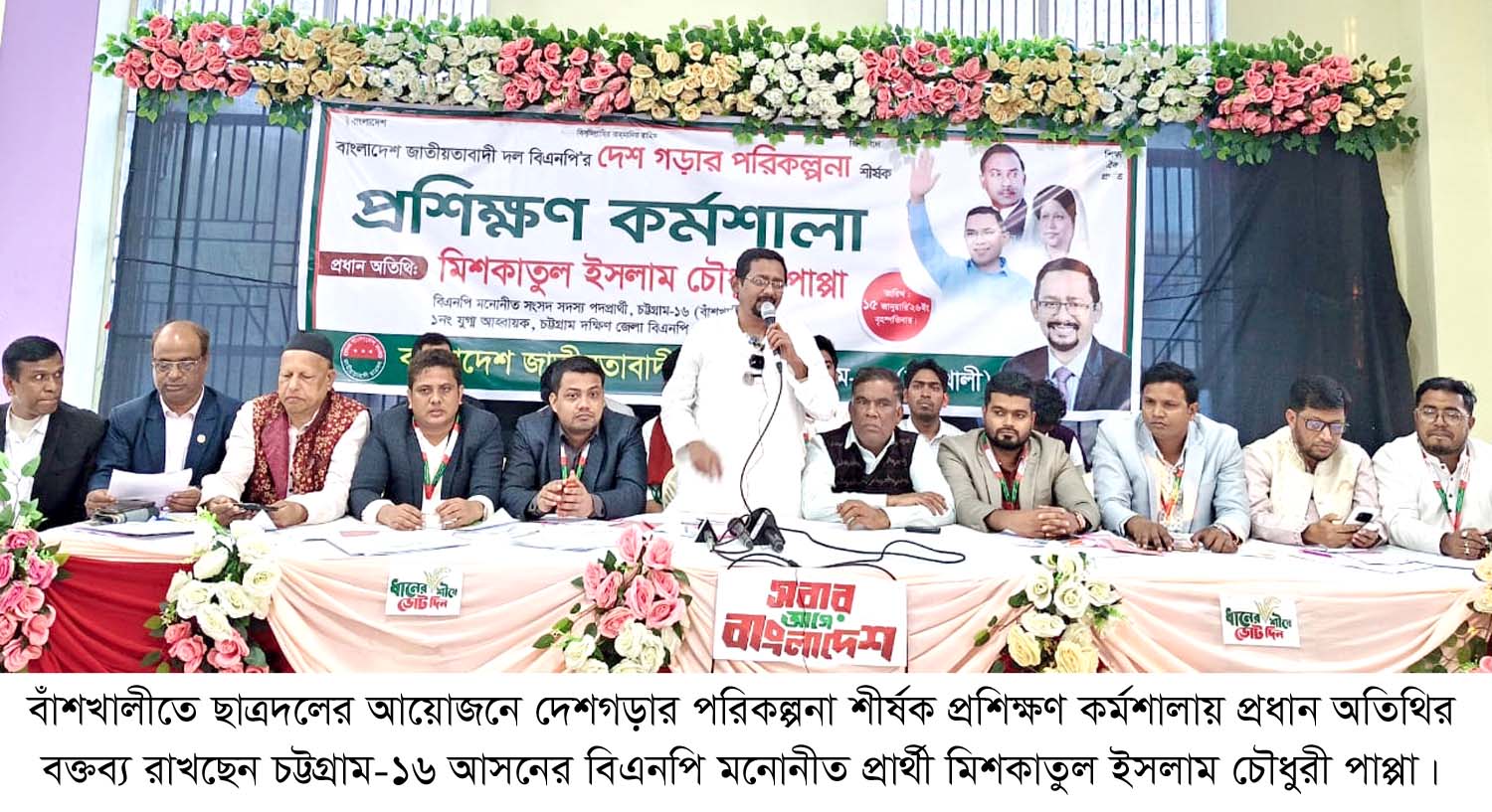 বাঁশখালীতে ছাত্রদল আয়োজিত দেশগড়ার পরিকল্পনা শীর্ষক প্রশিক্ষণ কর্মশালায় চট্টগ্রাম-১৬ বাঁশখালী সংসদীয় আসনের বিএনপি মনোনীত ধানের শীষের প্রার্থী জেলা বিএনপির যুগ্ম আহ্বায়ক মিশকাতুল ইসলাম চৌধুরী পাপ্পা বলেন, আমাদের আচরণ, কথা ও কর্মের মাধ্যমেই মানুষ বিএনপিকে বিচার করবে। তাই আমাদের হতে হবে সৎ, আদর্শবান, ত্যাগী ও জনগণের পাশে থাকা রাজনৈতিক কর্মী। বাংলাদেশ আজ এক সংকটময় সময় অতিক্রম করছে। গণতন্ত্র সংকুচিত, মানুষের ভোটাধিকার হরণ করা হয়েছে, অর্থনীতি চাপে, বেকারত্ব বেড়েছে, দ্রব্যমূল্যের ঊর্ধ্বগতিতে সাধারণ মানুষ দিশেহারা।
