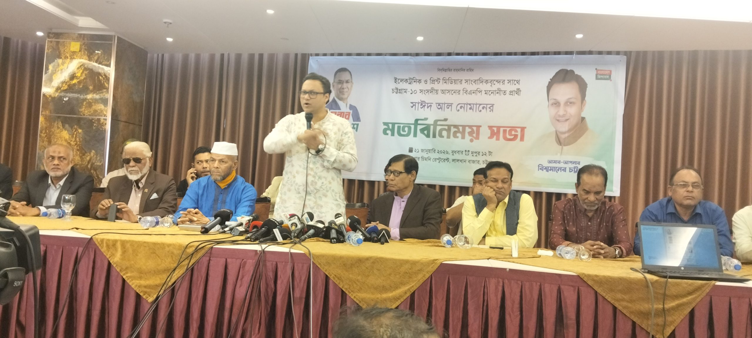 চট্টগ্রাম-১০ আসনে বিএনপির মনোনীত প্রার্থী সাঈদ আল নোমান বলেছেন,আমার পিতা আব্দুল্লাহ আল নোমান শুধু গণমানুষের নেতা ছিলেন না, নীরবে চট্টগ্রামকে বানিজ্যিক রাজধানী সহ উন্নয়নমূলক কাজ করে গেছেন তার অবদানের কথা কেউ ভুলতে পারবেনা। তিনি কর্ণফুলী তৃতীয় সেতু নির্মাণ, চট্টগ্রাম শিক্ষাবোর্ড প্রতিষ্ঠা, নব্বইয়ের গণঅভ্যুত্থানে চার শহীদের স্মরণে কলেজ প্রতিষ্ঠা করেন।তিনি আরো বলেন, ভেটেরিনারি অ্যান্ড অ্যানিমেল সায়েন্সেস বিশ্ববিদ্যালয়-যা একটি মুরগির খামার থেকে পূর্ণাঙ্গ বিশ্ববিদ্যালয়ে রূপ নেয়ার জন্য কাজ করেছেন। এ ছাড়া স্টেডিয়াম উন্নয়ন, জমিয়াতুল ফালাহ ও বিমানবন্দর সম্প্রসারণে কাজের কথাও উল্লেখ করেন তিনি।আমি আমার পিতার অসমাপ্ত কাজ সমাপ্ত করতে সকলের দোয়া কামনা করেন।