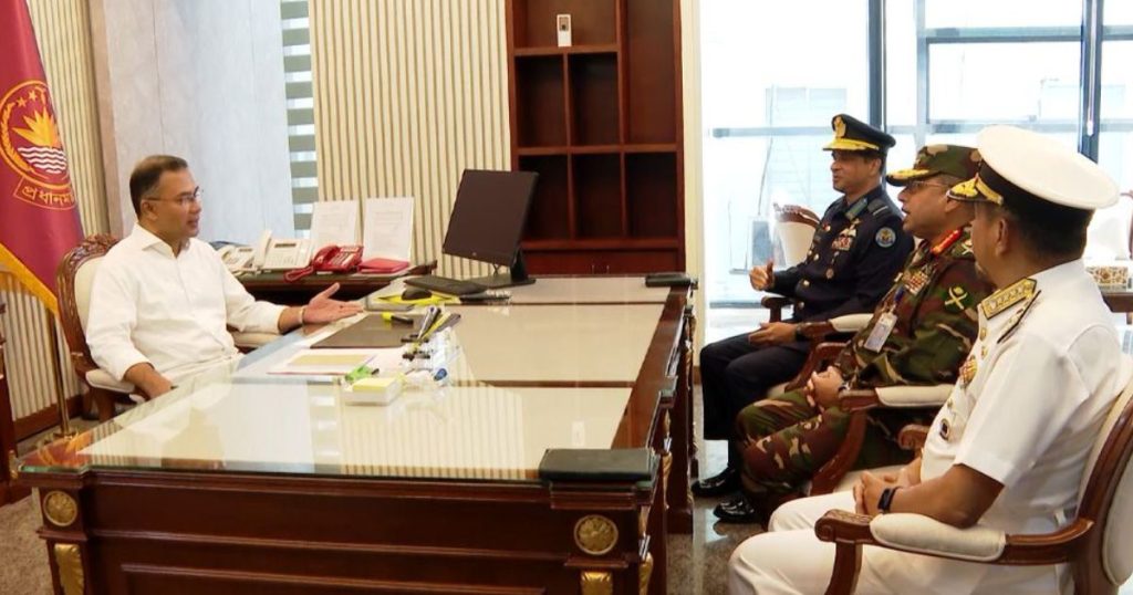 বৃহস্পতিবার দুপুরে মন্ত্রিপরিষদ বিভাগে প্রধানমন্ত্রী তারেক রহমানের সঙ্গে দেখা করতে আসেন সেনাবাহিনী প্রধান জেনারেল ওয়াকার-উজ-জামান, নৌবাহিনী প্রধান অ্যাডমিরাল এম নাজমুল হাসান এবং বিমানবাহিনী প্রধান এয়ার চিফ মার্শাল হাসান মাহমুদ খাঁন।