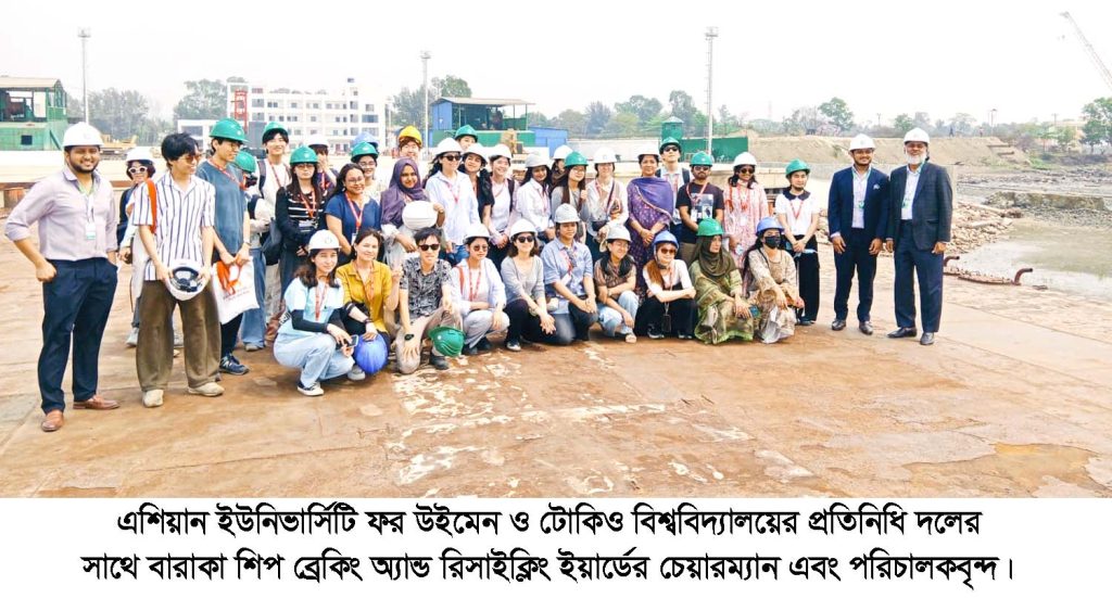 এশিয়ান ইউনিভার্সিটি ফর উইমেন (অটড) এবং জাপানের টোকিও বিশ্ববিদ্যালয় এর একটি প্রতিনিধিদল গতকাল ৯ ই মার্চ সকালে চট্টগ্রামের বারাকা শিপ ব্রেকিং অ্যান্ড রিসাইক্লিং ইয়ার্ড পরিদর্শন করেন। এশিয়ান ইউনিভার্সিটি ফর উইমেন- ইউনিভার্সিটি অব টোকিও এক্সচেঞ্জ প্রোগ্রামের অংশ হিসেবে ১৫ জন শিক্ষার্থী, ২ জন শিক্ষক এবং এইউডব্লিউ অটড-এর শিক্ষার্থীদের নিয়ে মোট প্রায় ৪০ সদস্যের একটি দল এই পরিদর্শনে অংশ নেন। বারাকা শিপ ব্রেকিং অ্যান্ড রিসাইক্লিং ইয়ার্ডের চেয়ারম্যান আলহাজ্ব মুহাম্মদ শামসুল আলমের সভাপতিত্বে এতে অতিথি হিসেবে উপস্থিত ছিলেন বিএমএমওএ এর সভাপতি ক্যাপ্টেন মুহাম্মদ এনাম চৌধুরী, জাপাানের ইউনিভার্সিটি অব টোকিও এর গ্লোবাল এডুকেশন সেন্টারের ভাইস ডাইরেক্টর অধ্যাপক ড. মারি ইয়োশিহারা। জাপানের ইউনিভার্সিটি অব টোকিও এর গ্লোবাল এডুকেশন সেন্টারের প্রজেক্ট লেকচারার ড.শো শিমোয়ামাদা, এশিয়ান ইউনিভার্সিটি ফর উইমেন এর প্ল্যানিং এন্ড ডেভেলপমেন্টের ডাইরেক্টর তপু চৌধুরী। বারাকা শিপ ব্রেকিং অ্যান্ড রিসাইক্লিং ইয়ার্ডের সিও ফাহিম ইবনে আলম। এতে কি -নোট স্পীকার ছিলেন বারাকা শিপ ব্রেকিং অ্যান্ড রিসাইক্লিং ইয়ার্ডে সিইও ফুয়াদ ইবনে আলম। পরিদর্শনের মূল উদ্দেশ্য ছিল বাংলাদেশের জাহাজ পুনর্ব্যবহার শিল্প সম্পর্কে সরাসরি ধারণা নেওয়া এবং বিশেষ করে এই খাতে কর্মরত শ্রমিকদের অভ্যন্তরীণ অভিবাসন, মাইগ্রেশন অব লেবার ও তাদের কর্মপরিবেশ সম্পর্কে বোঝা। পরিদর্শনের সময় প্রতিনিধিদলকে বারাকা শিপ ব্রেকিং অ্যান্ড রিসাইক্লিং ইয়ার্ডের কার্যক্রম, নিরাপত্তা ব্যবস্থা এবং পরিবেশবান্ধব জাহাজ পুনর্ব্যবহার প্রক্রিয়া সম্পর্কে বিস্তারিত অবহিত করা হয়। পাশাপাশি শ্রমিকদের বিভিন্ন অঞ্চল থেকে চট্টগ্রামে এসে এই শিল্পে কাজ করার সামাজিক ও অর্থনৈতিক প্রেক্ষাপট নিয়েও আলোচনা করা হয়। প্রতিনিধিদলের সদস্যরা জাহাজ পুনর্ব্যবহার শিল্পে বাংলাদেশের গুরুত্বপূর্ণ ভূমিকার প্রশংসা করেন এবং এ ধরনের শিক্ষামূলক ভিজিট ভবিষ্যতে গবেষণা ও আন্তর্জাতিক সহযোগিতা বাড়াতে সহায়ক হবে বলে আশা প্রকাশ করেন।