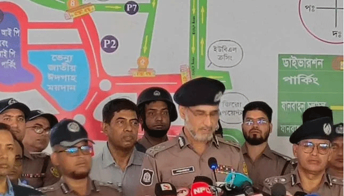 জাতীয় ঈদগাহ কেন্দ্রিক ট্রাফিক ব্যবস্থাপনার কথা জানাতে গিয়ে কমিশনার বলেন, জিরো পয়েন্ট ক্রসিং, সরকারি কর্মচারী হাসপাতাল, হাইকোর্ট ক্রসিং, প্রেস ক্লাব লিংক রোড, পররাষ্ট্র মন্ত্রণালয়ের পেছনের গলি, ইউবিএল বা পল্টন ক্রসিং, পুলিশ কন্ট্রোল রুম গ্যাপ, মৎস্যভবন ক্রসিং এলাকায় পুলিশের ডাইভারশন থাকবে। এসব এলাকা থেকে মুসল্লিদেরকে পায়ে হেঁটে ঈদগাহে প্রবেশ করতে হবে। নির্ধারিত পার্কিং স্থানের বাইরে গাড়ি নিয়ে আশেপাশে ঢোকার চেষ্টা না করতে সবাইকে অনুরোধ করেন তিনি।