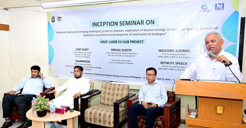 চট্টগ্রাম বিশ্ববিদ্যালয়ের প্রাণরসায়ন ও অনুপ্রাণ বিজ্ঞান বিভাগে “Institutional readiness for emerging-reemerging pandemic diseases: exploration of disease etiology at molecular level, evaluation of treatments in practice and development of novel antiviral strategies” শীর্ষক এক গুরুত্বপূর্ণ সেমিনার আজ বুধবার (১৫ এপ্রিল ২০২৬) বেলা ১২টায় বিভাগের ১নং লেকচার থিয়েটারে অনুষ্ঠিত হয়। HEAT-11009-CU সাব-প্রজেক্টের আওতায় এই সেমিনারটি সম্পন্ন হয়।