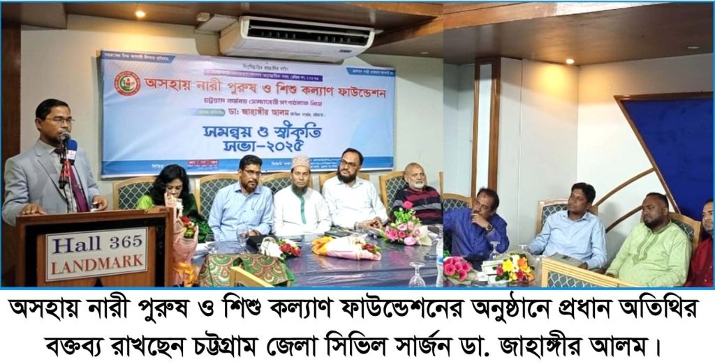 চট্টগ্রাম জেলা সিভিল সার্জন ডা. জাহাঙ্গীর আলম অসহায় নারী-পুরুষ ও শিশু কল্যাণ ফাউন্ডেশনের উদ্যোগে চট্টগ্রামে কর্মরত বিভিন্ন স্বেচ্ছাসেবী সংগঠনকে নিয়ে অনুষ্ঠিত হলো “সমন্বয় ও স্বীকৃতি সভায় প্রধান অতিথির বক্তব্যে “সমাজকে সুন্দরভাবে গড়ে তুলতে হলে সবার আগে এগিয়ে আসতে হবে সেবামূলক কাজে। অসহায় মানুষের পাশে দাঁড়ানো শুধু দায়িত্ব নয়, এটি আমাদের নৈতিক ও মানবিক কর্তব্য। আমাদের ছোট্ট একটি উদ্যোগও কারো জীবনে বড় পরিবর্তন আনতে পারে।” সংগঠনের প্রতিষ্ঠাতা চেয়ারম্যান এইচ.এম. ওসমান গণির সভাপতিত্বে আয়োজিত অনুষ্ঠানে প্রধান আলোচক হিসেবে বক্তব্য রাখেন অনলাইন নিউজ পোর্টাল শাপলা টেলিভিশনের ব্যবস্থাপনা পরিচালক ও বনফুল এন্ড কোম্পানী লিঃ এর জিএম আমানুল আলম। বিশেষ অতিথির বক্তব্য রাখেন লায়ন জাফর উল্লাহ, কলামিস্ট, লেখক, কবি, আবৃত্তি ও কণ্ঠশিল্পী এনায়েত হোসেন পলাশ। প্রধান সমন্নয়ক হিসাবে বক্তব্য রাখেন রোটারিয়ান আলহাজ্ব এস. এম. আজিজ।