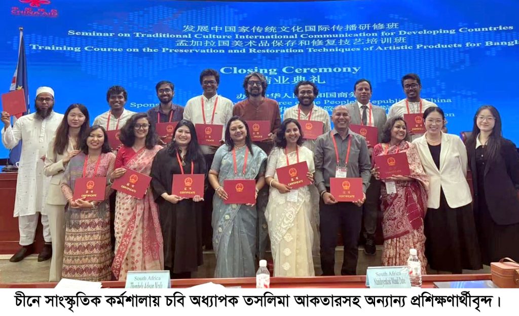 চীনে সাংস্কৃতিক নিদর্শন সুরক্ষা ও পুনরুদ্ধার কৌশল সম্পর্কিত একটি প্রশিক্ষণ কোর্স (গত ২১ শে আগষ্ট থেকে ১০ ই সেপ্টেম্বর পর্যন্ত) সম্প্রতি চীনের বেইজিং শহরের একটি কনফারেন্স হলে অনুষ্ঠিত হয়। এতে ৩ সদস্য বিশিষ্ট বাংলাদেশী শিল্প প্রতিনিধি দল অংশগ্রহণ করেন। প্রতিনিধি দলে ছিলেন সদস্য বাংলাদেশের চট্টগ্রাম বিশ্ববিদ্যালয়ের চারুকলা ইনস্টিটিউটের পরিচালক সহযোগী অধ্যাপক তসলিমা আকতার বাঁধন, চবির সহযোগী অধ্যাপক শারদ দাস, সহকারী অধ্যাপক লু বাই শু চৌধুরী। উক্ত প্রশিক্ষণ, সুরক্ষা ও নিদর্শন কর্মশালায় বিভিন্ন মোট ১৮ জন শিল্পী প্রশিক্ষণার্থী অংশগ্রহণ করে।