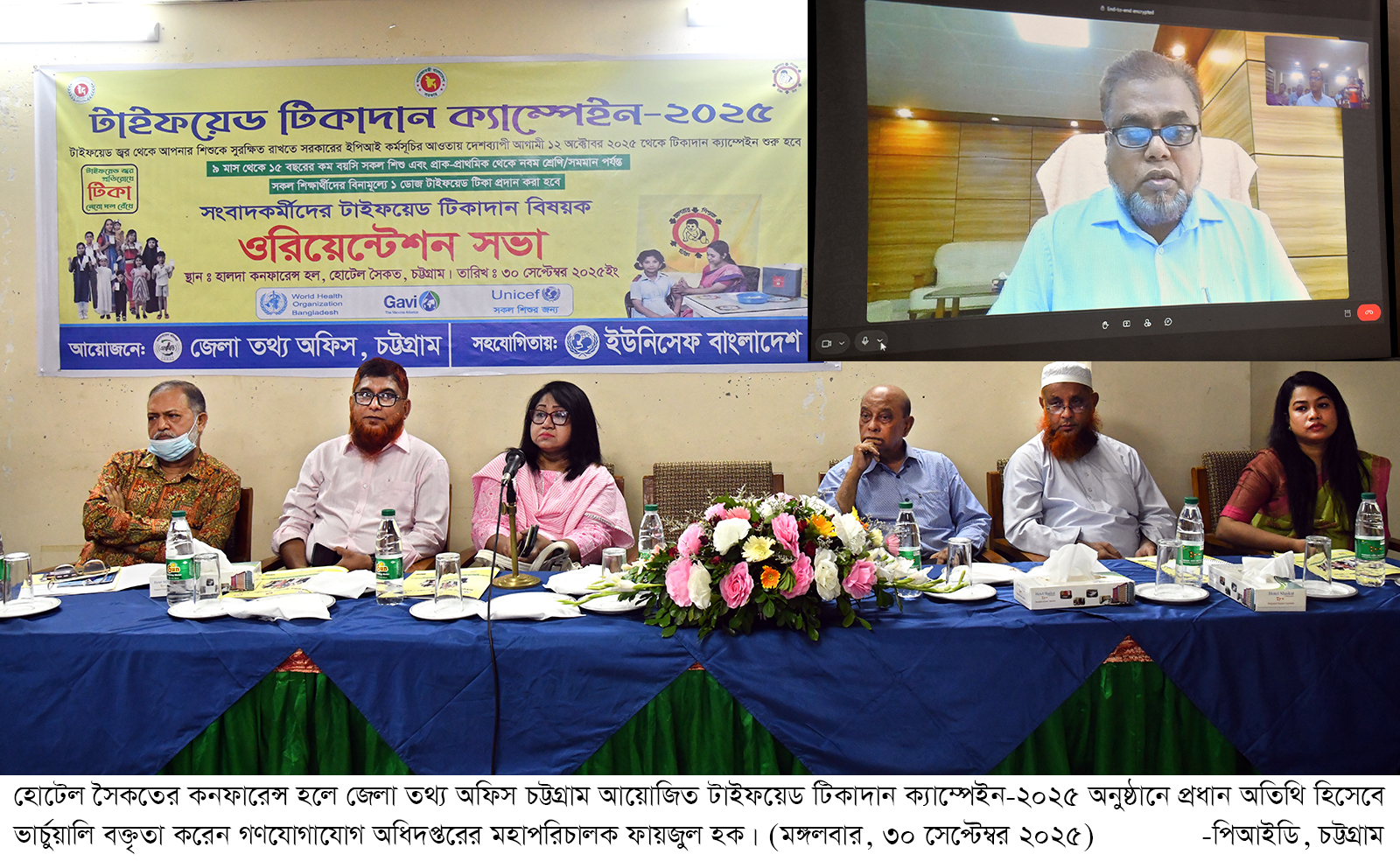 মহাপরিচালক আজ চট্টগ্রাম হোটেল সৈকত এর হালদা কনফারেন্স রুমে জেলা তথ্য অফিস চট্রগ্রাম এর আয়োজনে ও ইউনিসেফ এর সহযোগিতায় “টাইফয়েড টীকাদান ক্যাম্পেইন ২০২৫ “ উপলক্ষে স্কাউট ও গার্লস গাইডদের ওরিয়েন্টেশন সভায় প্রধান অতিথির বক্তব্যে এসব কথা বলেন। সভার মূল প্রবন্ধ উপস্থাপন করেন চট্টগ্রামের সিভিল সার্জন ডাঃ জাহাঙ্গীর আলম।