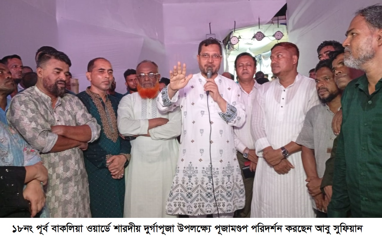 ক্যাপশন: ১৮নং পূর্ব বাকলিয়া ওয়ার্ডে শারদীয় দুর্গাপূজা উপলক্ষ্যে পূজামণ্ডপ পরিদর্শন করছেন আবু সুফিয়ান।