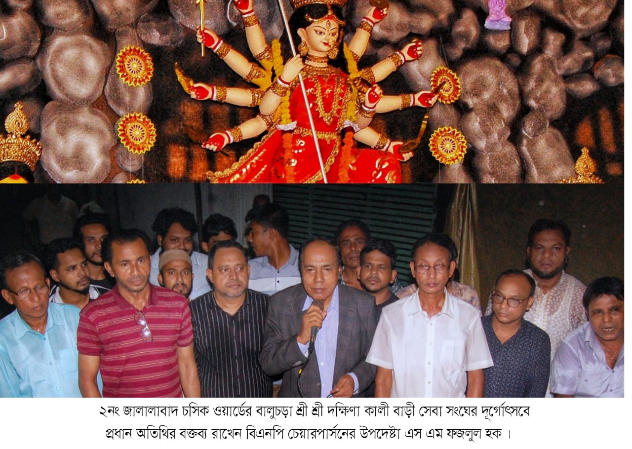 জালালাবাদ বালুচড়া শ্রী শ্রী দক্ষিণা কালী মন্দির সেবা সংঘ ও বিশ^রের বাড়ী হিমাচল সংঘ আয়োজিত দূর্গা উৎসব কমিটির সভাপতি শ্রী বিপ্লব সরকারের সভাপতিত্বে এক আলোচনা সভায় এস এম ফজলুল হক প্রধান অতিথির বক্তব্যে বলেন, ধর্ম যার যার রাষ্ট্র সকলের। সমাজ-সংস্কৃতি এবং ধর্মীয় কর্মকান্ড প্রতিপালনে এ জাতি আদিকাল থেকে সৌহার্দ্য ও সম্প্রীতির মাধ্যমে নিজ নিজ ধর্মীয় উৎসব উদযাপন করেছে। অতীতের মত এবারও ধর্মীয় পূর্ণ স্বাধীনতা-সম্প্রীতির মাধ্যমে সার্বজনীন পূজা উৎসব পালন হচ্ছে, বিএনপি সব সময় সম্প্রীতির জন্য কাজ করে।