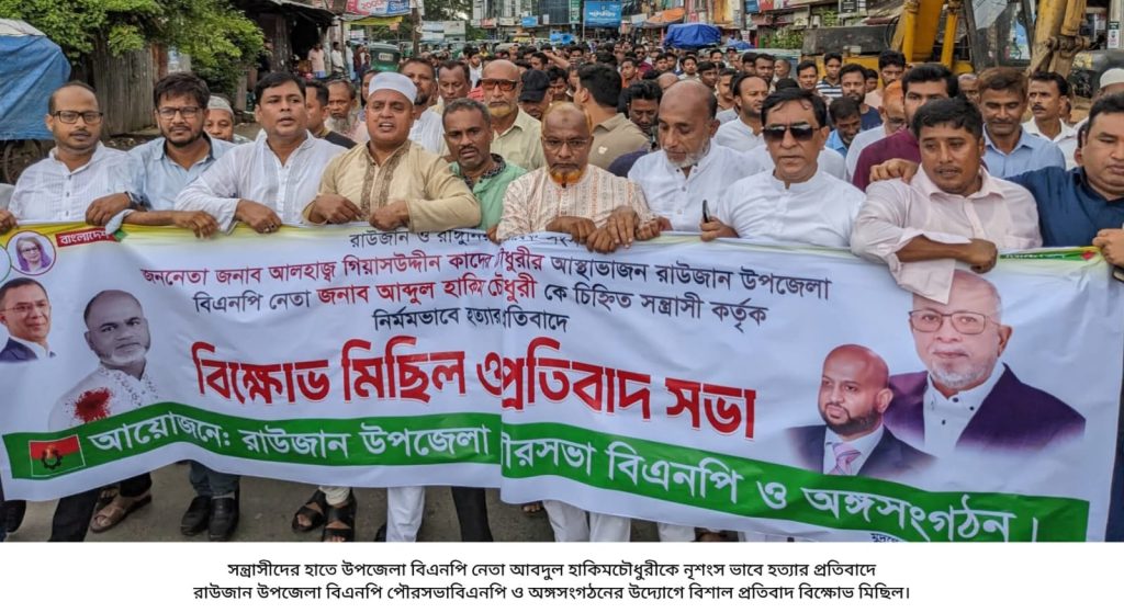 হত্যার প্রতিবাদে রাউজান উপজেলা, পৌরসভা বিএনপি ও অঙ্গসংগঠনের উদ্যোগে বিশাল প্রতিবাদ সমাবেশ ও বিক্ষোভ মিছিল অনুষ্ঠিত হয়। আজ ১১ অক্টোবর শনিবার দুপুরে উপজেলার দ্বিতীয় বানিজ্যিক কেন্দ্র নোয়াপাড়া পথের হাটে আয়োজিত বিক্ষোভ বিক্ষোভ মিছিলটি কাপ্তাই সড়ক হয়ে নোয়াপাড়া বাজার প্রদক্ষিণ করে। বিক্ষোভ মিছিল পূর্বে নোয়াপাড়া পথেরহাট বাজার সংলগ্ন মাঠে অনুষ্ঠিত সমাবেশে সভাপতিত্ব করেন উপজেলা বিএনপির সাবেক যুগ্ম আহ্বায়ক ফিরোজ আহমেদ। উত্তর জেলা স্বেচ্ছাসেবক দলের যুগ্ম আহ্বায়ক ইউসুফ তালুকদারের সঞ্চালনায় বক্তব্য রাখেন পৌরসভা বিএনপির সাবেক সাধারণ সম্পাদক সৈয়দ মনজুরুল হক, চট্টগ্রাম উত্তর জেলা বিএনপির সাবেক শিক্ষা বিষয়ক সম্পাদক মোহাম্মদ হাবিব উল্লাহ মাস্টার, জিয়া মঞ্চ কেন্দ্রীয় কমিটির সহ সাধারণ সম্পাদক হাজী জসিম উদ্দিন, চট্টগ্রাম উত্তর জেলা যুবদলের সহ-সভাপতি সাবের সুলতান কাজল, রাউজান উপজেলা বিএনপির সদস্য হাফেজ এম. এ. হাসেম, অ্যাডভোকেট হাসেম, সামসুল হক বাবু, রাউজান উপজেলা বিএনপির সাবেক যুগ্ম সাধারণ সম্পাদক মোহাম্মদ হারুন উর রশিদ, মোহাম্মদ আলম, মুবিনুল হক, পৌরসভা যুবদলের সদস্য সচিব শাহজাহান সাহিল, চট্টগ্রাম উত্তর জেলা ছাত্রদলের সাবেক যুগ্ম সম্পাদক ছোটন আজম, একরাম মিয়া, আইয়ুব খান জনি, শেখ নাজিম উদ্দিন, জানে আলম, তৌহিদুল ইসলাম, অ্যাডভোকেট মফিজ উদ্দিন ইমন, জানে আলম সিকদার, নজরুল ইসলাম, আবুল কাশেম রানা, নিজাম উদ্দিন চৌধুরী, বাপ্পা কুমার দাশ, আরাফাত রানা, মোহাম্মদ দিদার, জাহেদুল ইসলাম, মো. মুরাদ, হাসান মুরাদ, ইয়াকুব বাদশা , পাভেল, পারভেজ প্রমুখ।