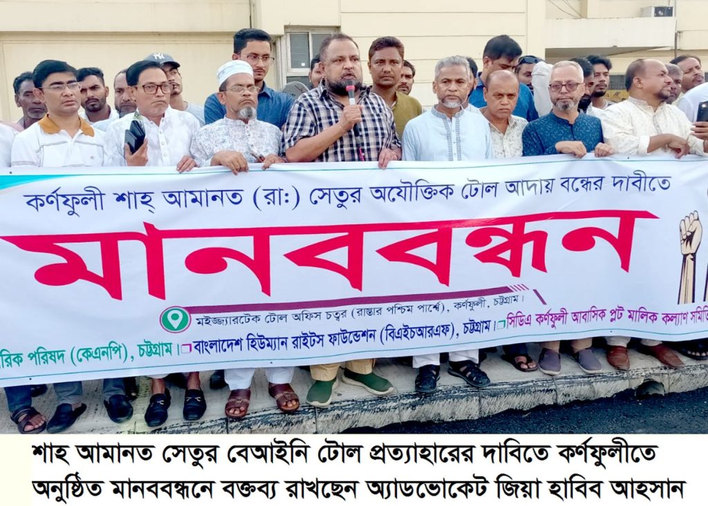 চট্টগ্রামের কর্ণফুলী উপজেলার মইজ্জ্যারটেক এলাকায় শাহ আমানত (রাঃ) সেতুর টোল প্লাজার সামনে বেআইনি, অবৈধ ও অসাংবিধানিক টোল প্রত্যাহারের দাবিতে এক মানববন্ধন ও বিক্ষোভ সমাবেশ অনুষ্ঠিত হয়েছে। শুক্রবার (১৭ অক্টোবর ২০২৫) বিকালে কর্ণফুলী নাগরিক পরিষদ, সিডিএ কর্ণফুলী আবাসিক প্লট মালিক কল্যাণ সমিতি এবং বাংলাদেশ হিউম্যান রাইটস ফাউন্ডেশন চট্টগ্রাম জেলা শাখার যৌথ উদ্যোগে এ কর্মসূচির আয়োজন করা হয়।