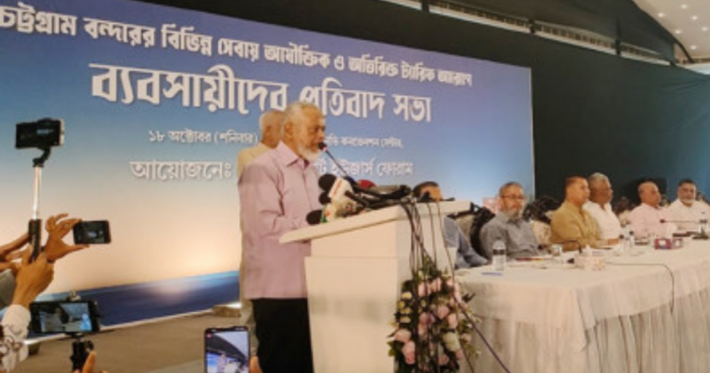 চট্টগ্রাম বন্দরে ট্যারিফ ফি বৃদ্ধির প্রতিবাদে চট্টগ্রাম পোর্ট ইউজার্স ফোরামের উদ্যোগে প্রতিবাদ সভা অনুষ্ঠিত হয়েছে। সভায় ব্যবসায়ী নেতারা সাতদিনের মধ্যে ট্যারিফ বাতিল না হলে চট্টগ্রাম বন্দর বন্ধের হুমকি দিয়েছেন। শনিবার (১৮ অক্টোবর) নগরের নেভি কনভেনশনে চট্টগ্রাম পোর্ট ইউজার্স ফোরামের আহ্বায়ক আমীর হুমায়ুন মাহমুদ চৌধুরীর সভাপতিত্বে প্রতিবাদ সভা অনুষ্ঠিত হয়।