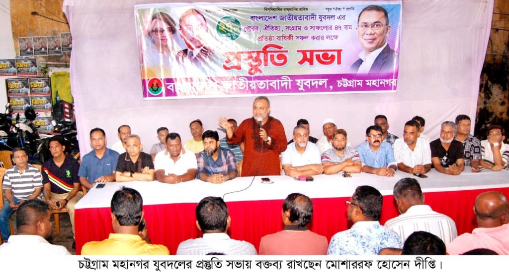 চট্টগ্রাম মহানগর যুবদলের সাবেক সভাপতি মোশাররফ হোসেন দীপ্তি বলেছেন, বিএনপির ভারপ্রাপ্ত চেয়ারম্যান তারেক রহমান নেতাকর্মীদের একটি কথাই বারবার বলে যাচ্ছেন রাষ্ট্র কাঠামোসহ বিএনপির ৩১ দফা ঘরে ঘরে পৌঁছে দিতে হবে। আমরা সেই নির্দেশনা অনুযায়ী কাজ করছি। এখানে স্পষ্ট করে লেখা আছে, কীভাবে আগামী দিনে দেশ চলবে। আগামী ২০২৬ সালের ফেব্রুয়ারিতে একটি অবাধ ও সুষ্ঠু নির্বাচনের মাধ্যমে যদি বিএনপি ক্ষমতায় আসে তাহলে ৩১ দফার আলোকে দেশ পরিচালনা করা হবে। আগামী নির্বাচনে সবাইকে ঐক্যবদ্ধভাবে ধানের শীষকে বিজয়ী করার লক্ষে কাজ করে যেতে হবে। বাংলাদেশ জাতীয়তাবাদী যুবদল এর গৌরব, ঐতিহ্য, সংগ্রাম ও সাফল্যের ৪৭তম প্রতিষ্ঠা বাষিকী সফল করার লক্ষে চট্টগ্রাম মহানগর যুবদলের উদ্যোগে এক প্রস্তুতি সভা আজ বৃহস্পতিবার (২৩ অক্টোবর), বিকাল ৪টায়, নগর বিএনপির দলীয় কার্যালয় নাসিমন ভবনে সভাপতির বক্তব্যে তিনি এসব কথা বলেন।