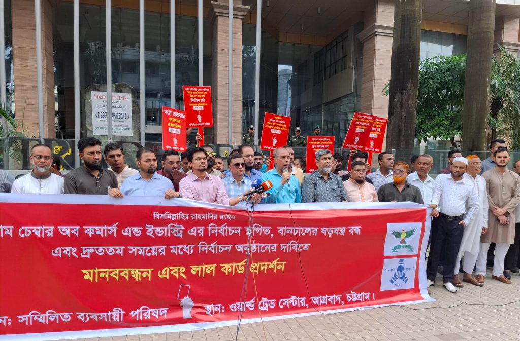 চিটাগাং চেম্বার অব কমার্স অ্যান্ড ইন্ডাস্ট্রি (সিসিসিআই) নির্বাচন বিলম্ব ও নির্বাচন প্রক্রিয়া বানচালের অপচেষ্টার প্রতিবাদে মানববন্ধন ও বিক্ষোভ সমাবেশ করেছে সম্মিলিত ব্যবসায়ী পরিষদ। শনিবার সকালে আগ্রাবাদের ওয়ার্ল্ড ট্রেড সেন্টারের সামনে এ কর্মসূচি পালন করেন ব্যবসায়ীরা। এসময় নির্বাচনে বিঘ্নকারীদের বিরুদ্ধে লাল কার্ড প্রদর্শন করা হয় এবং দ্রুত ভোট আয়োজনের জোর দাবি জানানো হয়।