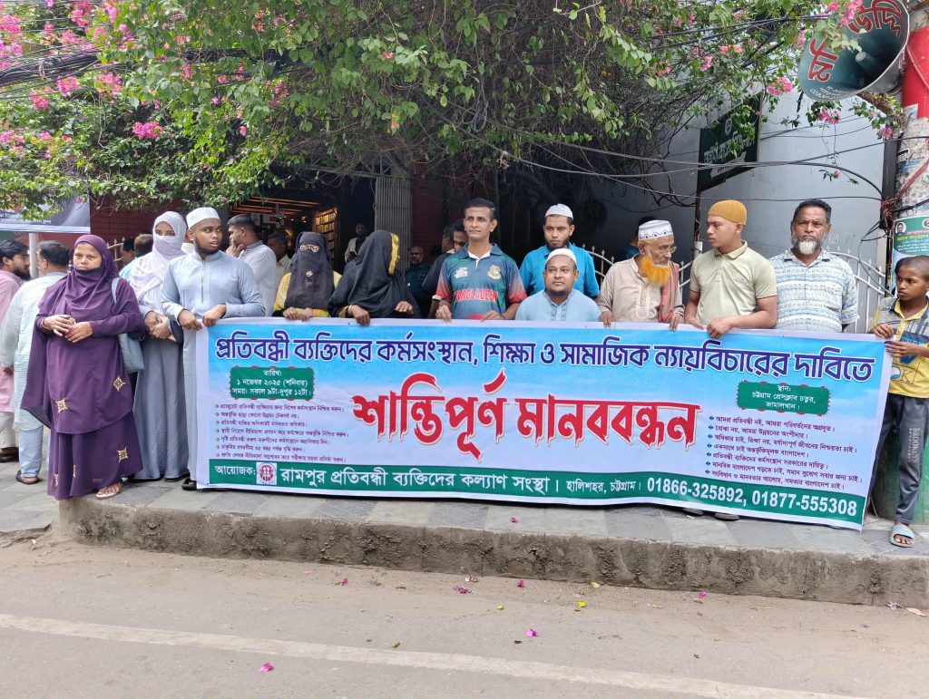 প্রতিবন্ধী ব্যক্তিদের কর্মসংস্থান, শিক্ষা ও সামাজিক ন্যায়বিচারের দাবিতে শান্তিপুর্ণ মানববন্ধন অনুষ্ঠিত হয়েছে। আজ ১ নভেম্বর (শনিবার) সকাল ১০ টায় চট্টগ্রাম প্রেসক্লাবে রামপুর প্রতিবন্ধী ব্যক্তিদের কল্যাণ সংস্থার উদ্যোগে এই মানববন্ধন অনুষ্ঠিত হয়।