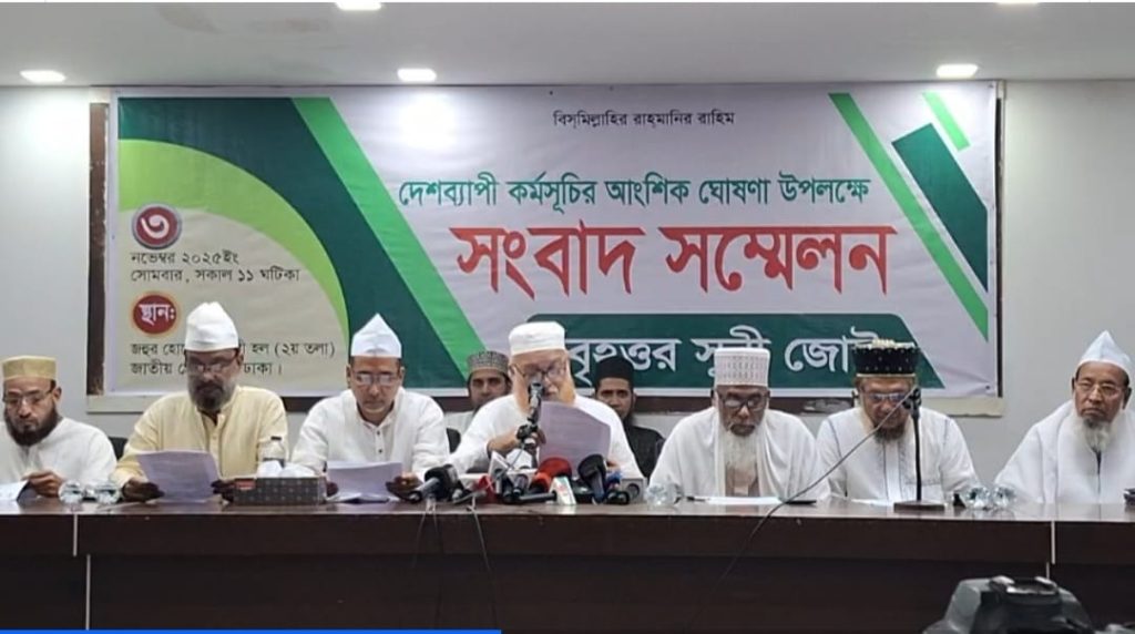 বৃহত্তর সুন্নী জোটের উদ্যোগে অদ্য ৩ নভেম্বর ‘২৫ সোমবার বেলা ১১ টায় ঢাকা জাতীয় প্রেসক্লাব জহুরুল হক হলে আহুতসংবাদ সম্মেলনে বৃহত্তর সুন্নী জোট নেতৃবৃন্দ বলেন-নির্বাচন কমিশন কর্তৃক ফেব্রুয়ারী ‘২৬ এ ত্রয়োদশ জাতীয় সংসদ নির্বাচন অনুষ্ঠানের ঘোষণা দেয়া হলেও এখনো চুড়ান্ত তারিখ ঘোষণা না করাতে অপ্রয়োজনীয় বিতর্কের জন্ম দিচ্ছে। অদ্যাবধি রাজনৈতিক দলগুলোর মধ্যে কোনরূপ ঐকমত্য প্রতিষ্ঠিত হয়নি। জাতির মধ্যে বিভাজন সৃষ্টি করে একটি সর্বজন গ্রহণযোগ্য নির্বাচন আয়োজন সম্ভব নয়। সংবাদ সম্মেলনে বক্তারা অভিযে করে বলেন- গত দেড় দশকে অনুষ্ঠিত জাতীয় নির্বাচনগুলো ছিল বিতর্কিত। জনগণ ভোটাধিকার প্রয়োগ থেকে বঞ্চিত