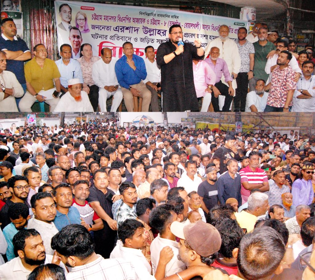 চট্টগ্রাম মহানগর বিএনপির আহ্বায়ক ও চট্টগ্রাম-৮ আসনের ধানের শীষের প্রার্থী জনাব এরশাদ উল্লাহ নির্বাচনী গণসংযোগকালীন সন্ত্রাসী হামলার প্রতিবাদে চট্টগ্রাম মহানগর বিএনপির উদ্যোগে এক প্রতিবাদ সমাবেশ অনুষ্ঠিত হয়।
