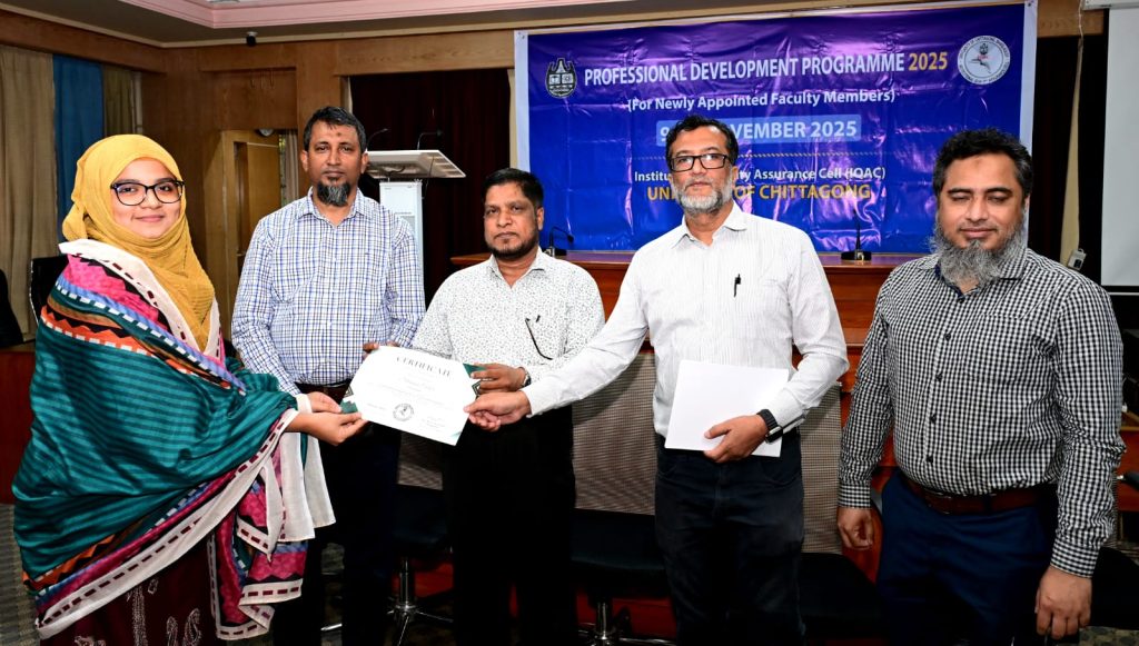 চট্টগ্রাম বিশ্ববিদ্যালয় ইনস্টিটিউশনাল কোয়ালিটি এস্যুরেন্স সেলের (আইকিউএসি) উদ্যােগে বিশ্ববিদ্যালয়ের বিভিন্ন বিভাগ/ইনস্টিটিউটে সম্প্রতি নিয়োগপ্রাপ্ত শিক্ষকদের পাঁচদিনব্যাপী (৯-১৩ নভেম্বর) “Foundation Training Program For Professional Development” শীর্ষক প্রশিক্ষণ শেষে আজ বৃহস্পতিবার (১৩ নভেম্বর ২০২৫) বিকাল ৪টায় চবি উপাচার্য দপ্তরের সম্মেলন কক্ষে প্রশিক্ষণপ্রাপ্ত শিক্ষকদের সনদ প্রদান করা হয়। এতে প্রধান অতিথি হিসেবে উপস্থিত ছিলেন চট্টগ্রাম বিশ্ববিদ্যালয়ের মাননীয় উপ-উপাচার্য (একাডেমিক) প্রফেসর ড. মোহাম্মদ শামীম উদ্দিন খান।
