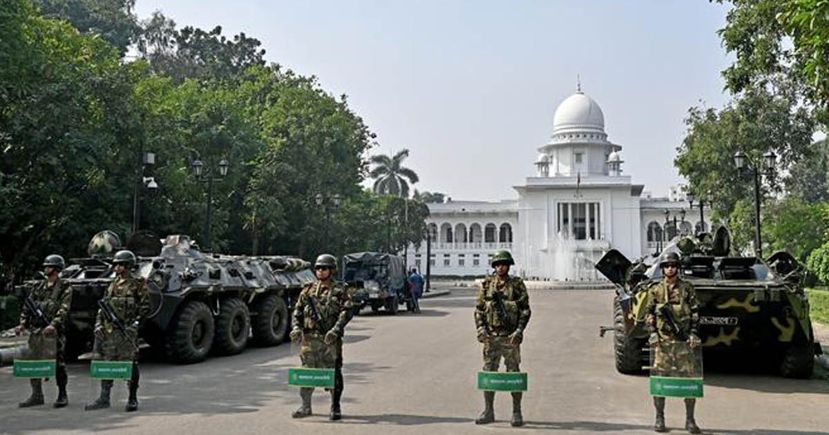 ট্রাইব্যুনাল ভবনের চারদিকে ভোর থেকেই দেখা যাচ্ছে টহলরত সেনা যান, ব্যাঙ্কার ও ব্যারিকেড।